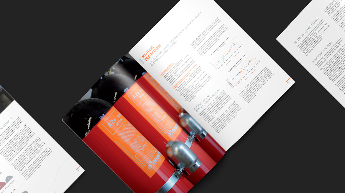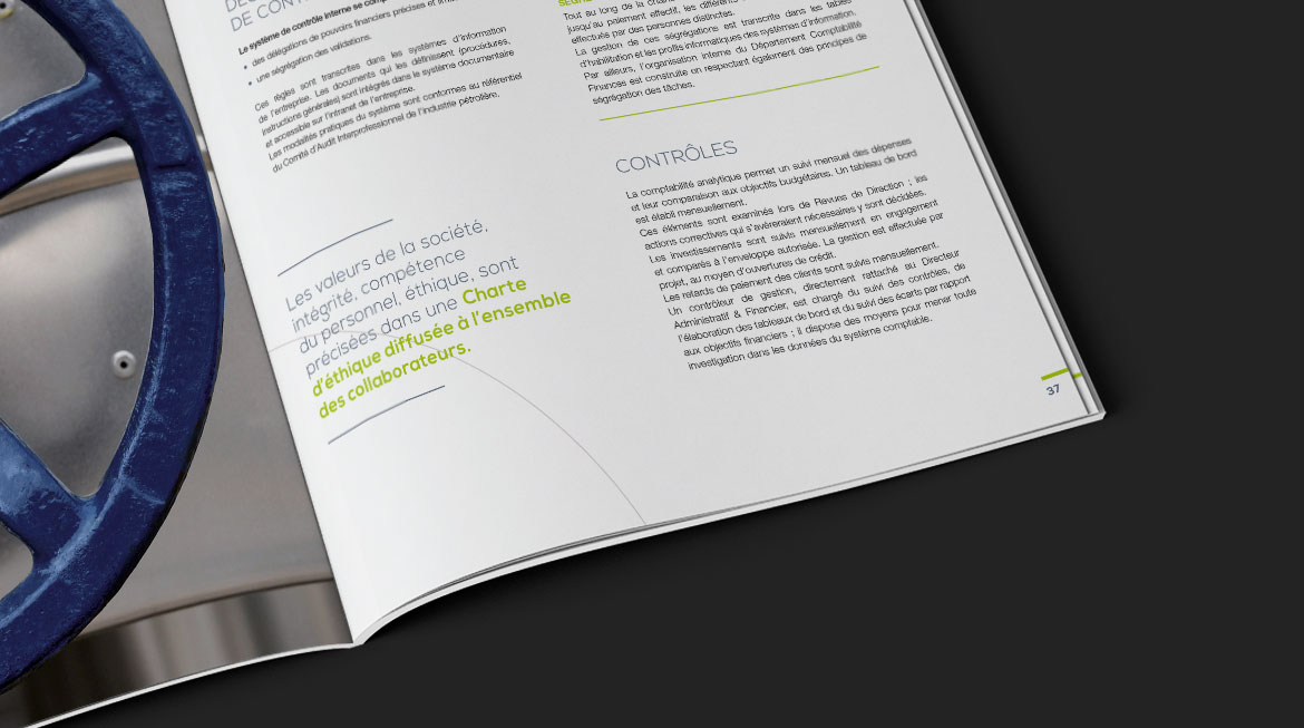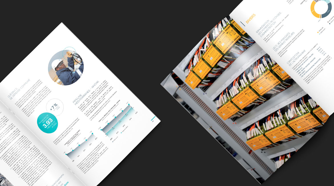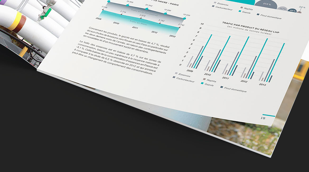 Création graphique de rapports annuel et financier pour le compte de Trapil, exploitant francais des pipelines d’hydrocarbures liquides qui assure ainsi le ravitaillement de grandes métropoles françaises et d’aéroports. Mise en page, création des infographies, retouche photograpique,... avaient pour objectif la valorisation graphique d'un contenu dense et riche en informations.